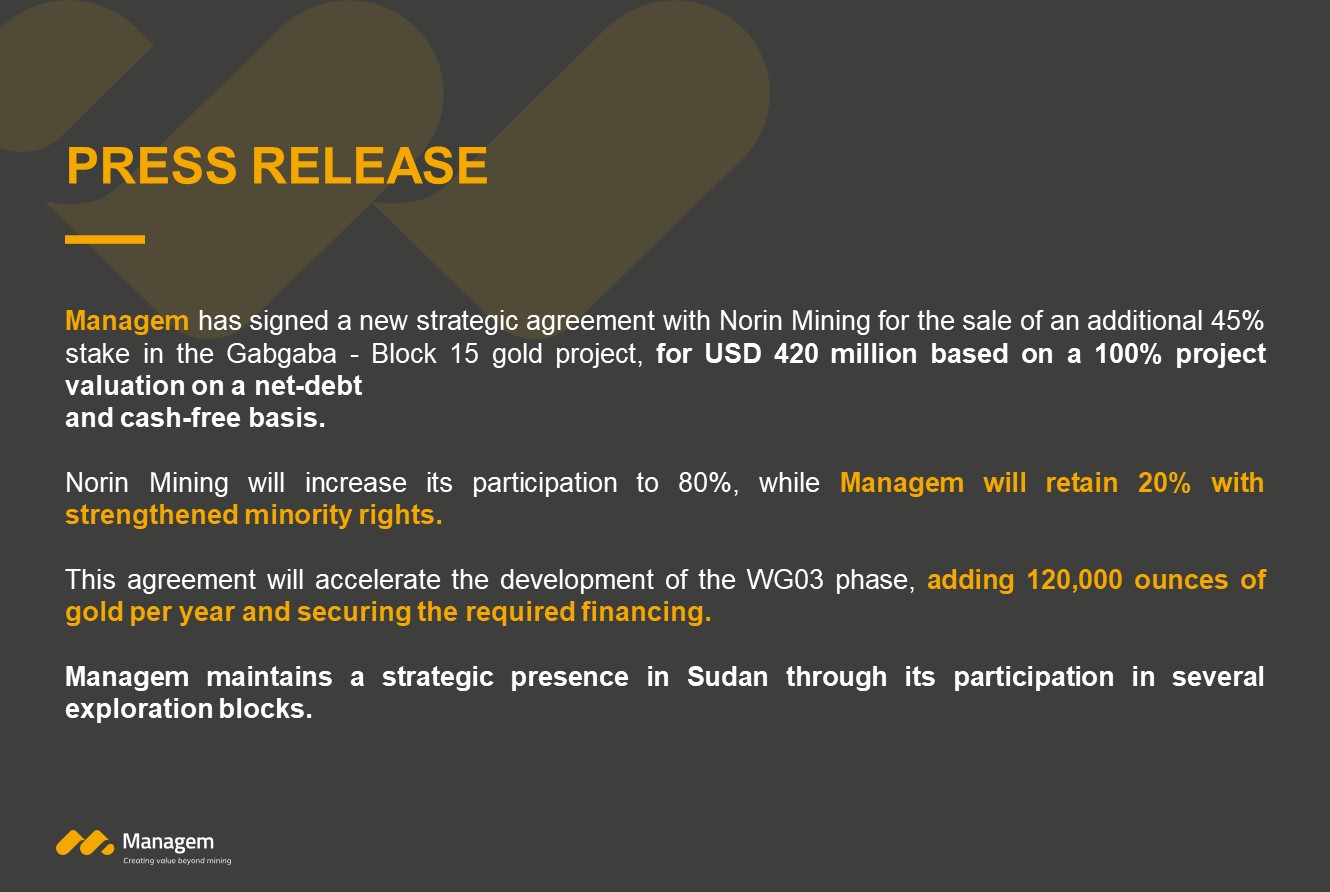 Managem has signed a new strategic agreement with Norin Mining for the sale of an additional 45% stake in the Gabgaba - Block 15 gold project, for USD 420 million based on a 100% project valuation on a net-debt and cash-free basis.
