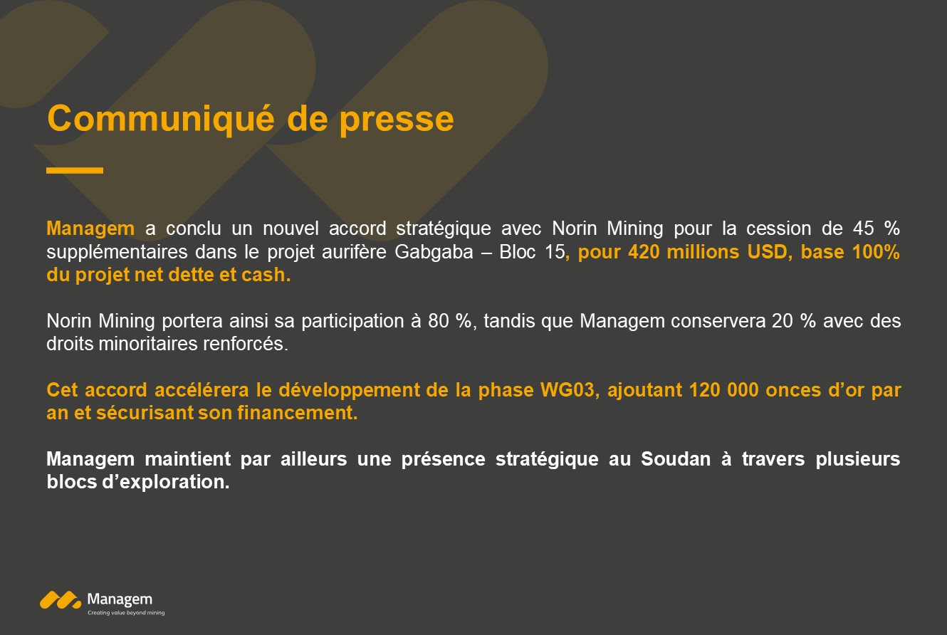 Managem est un groupe minier d’envergure internationale à l’ancrage résolument africain, avec une présence dans 7 pays du continent. Présent d’abord dans les métaux comme le cobalt, le cuivre ou le zinc, il s’est diversifié dans les métaux précieux, avec l’argent et l’or. Managem compte aujourd’hui environ 5000 collaborateurs de 28 nationalités, répartis dans 13 exploitations minières et 20 unités industrielles, toutes sur le continent africain. Découvrez nos opérations et nos projets
